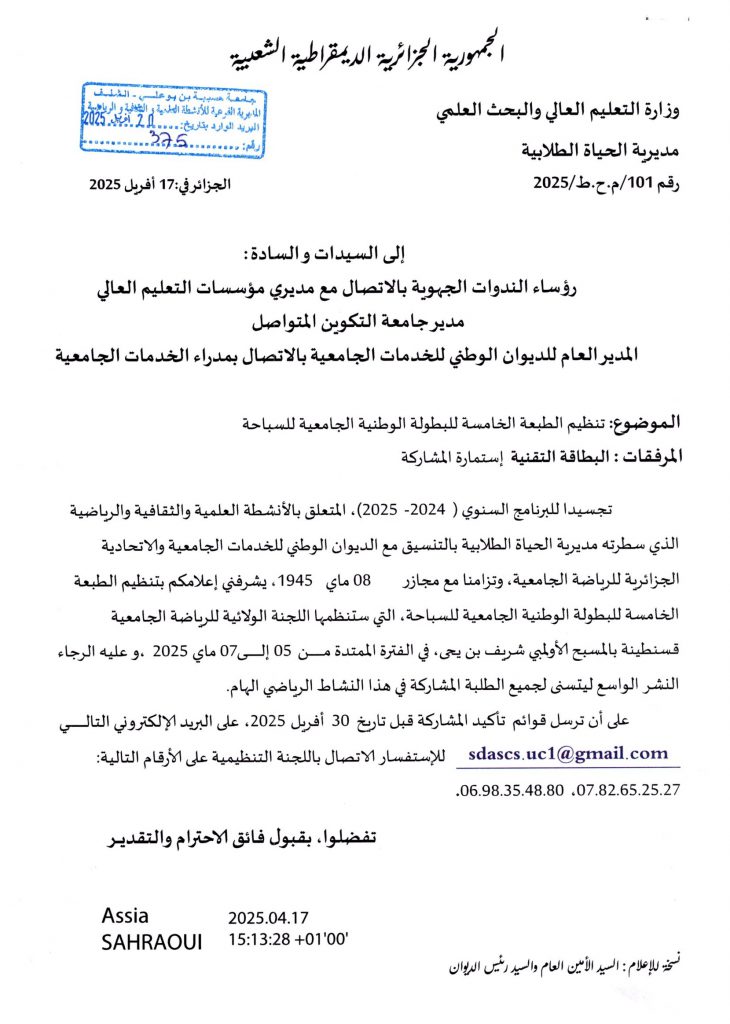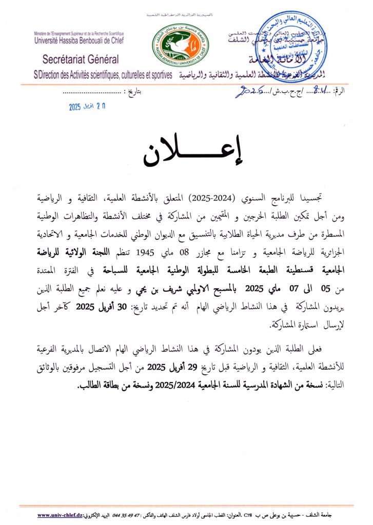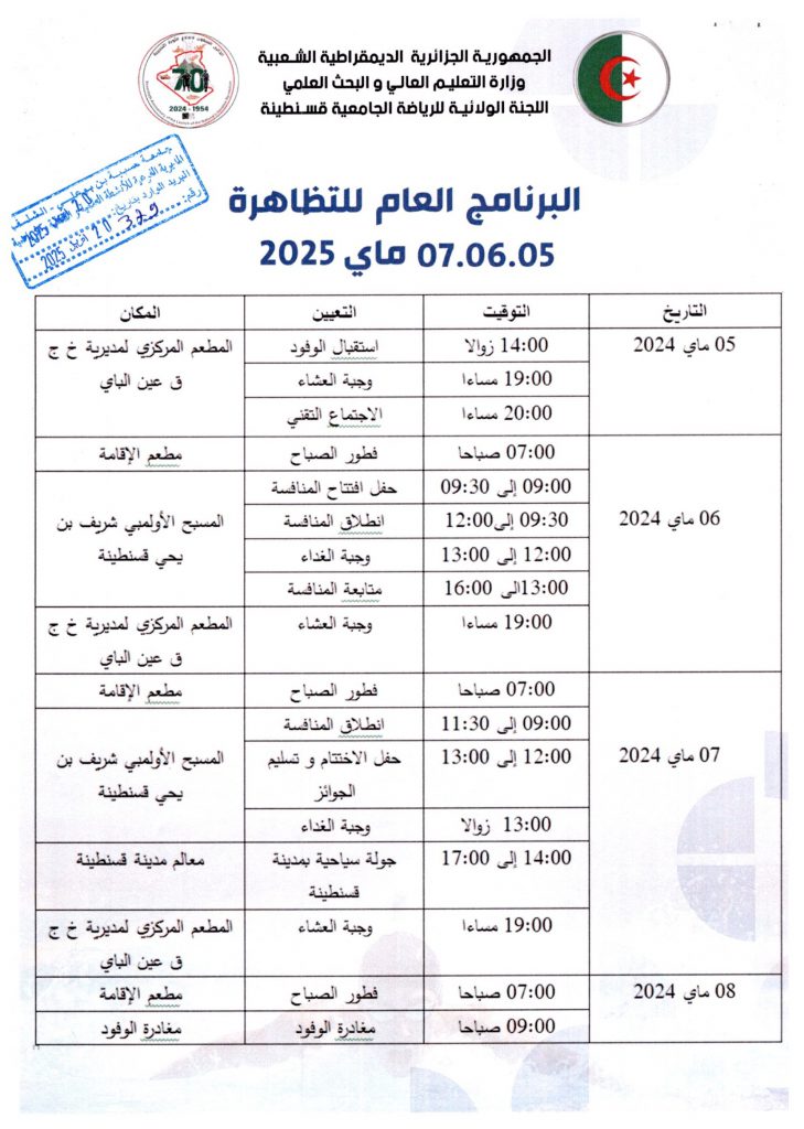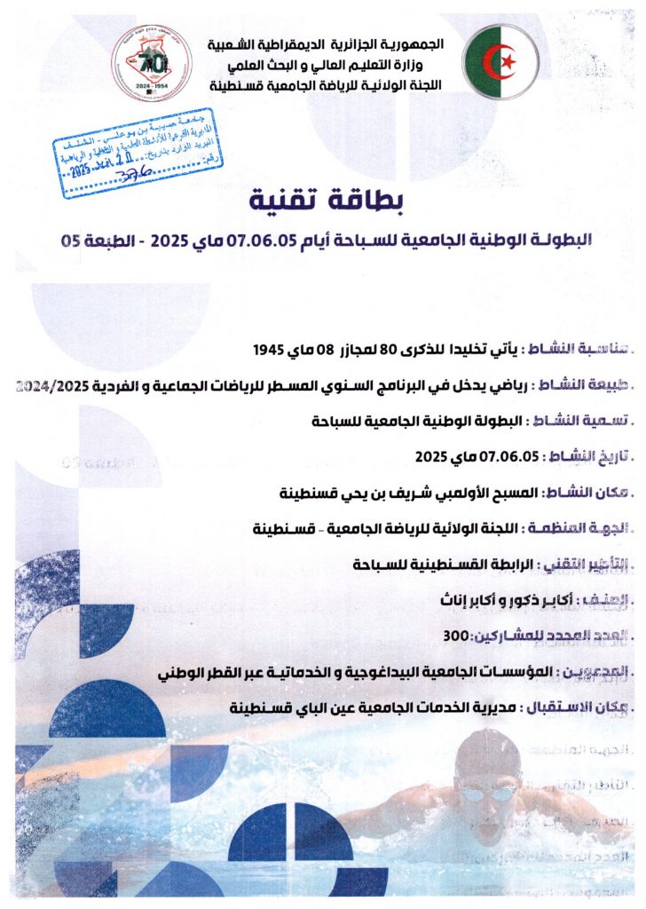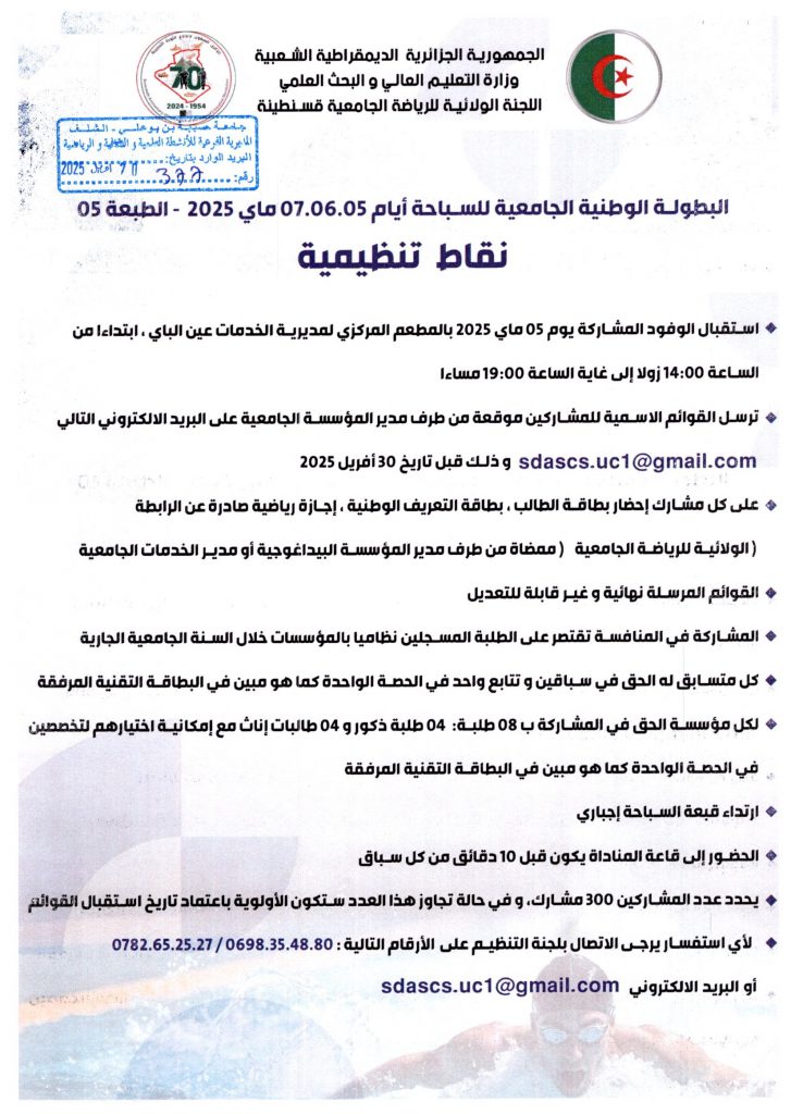 تنظم اللجنة الولائية للرياضة الجامعية قسنطينة الطبعة الخامسة للبطولة الوطنيةالجامعية للسباحةبواسطة zouatenia mhamed / 20 أبريل، 2025