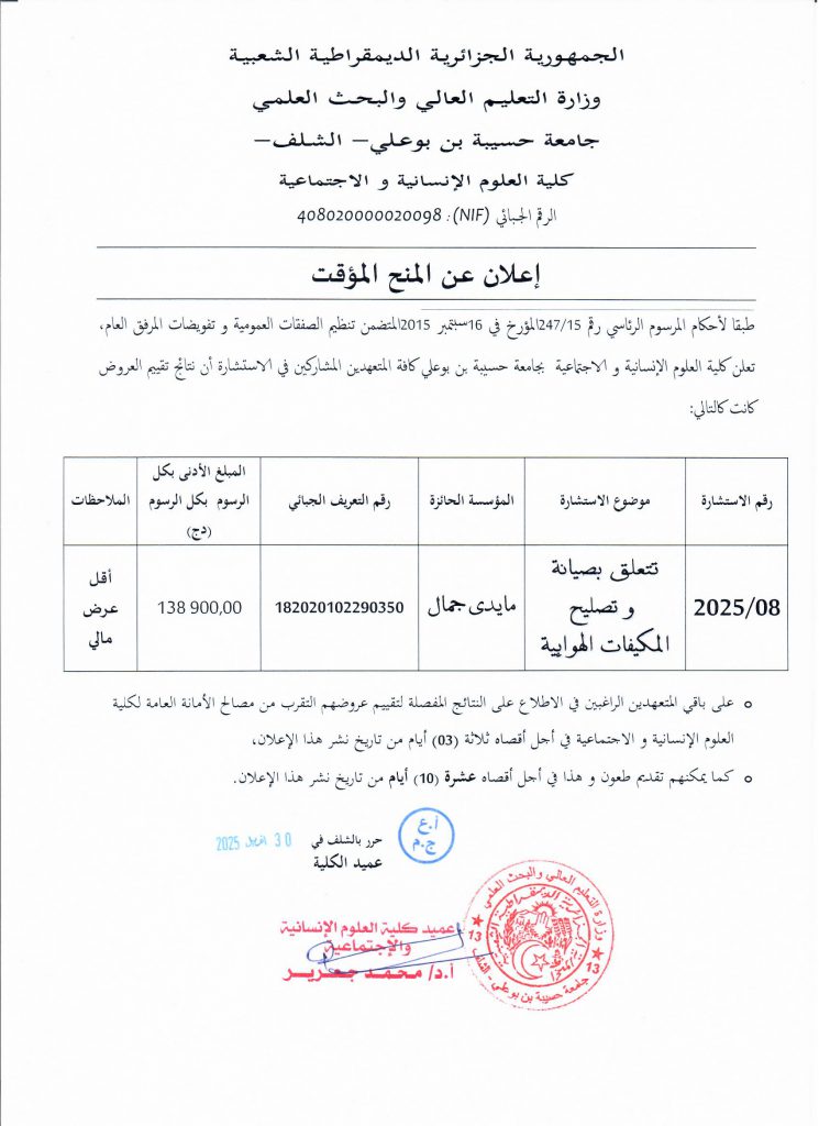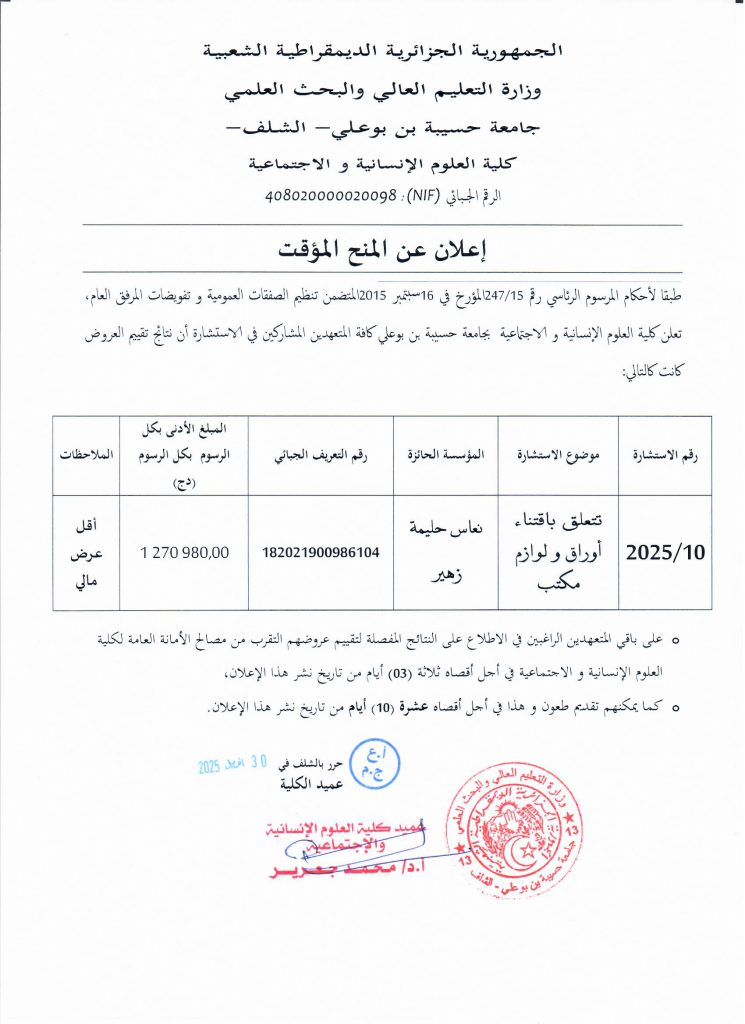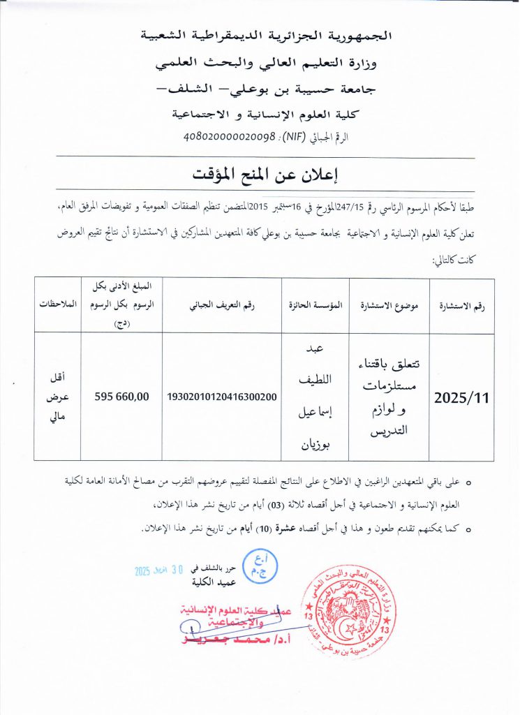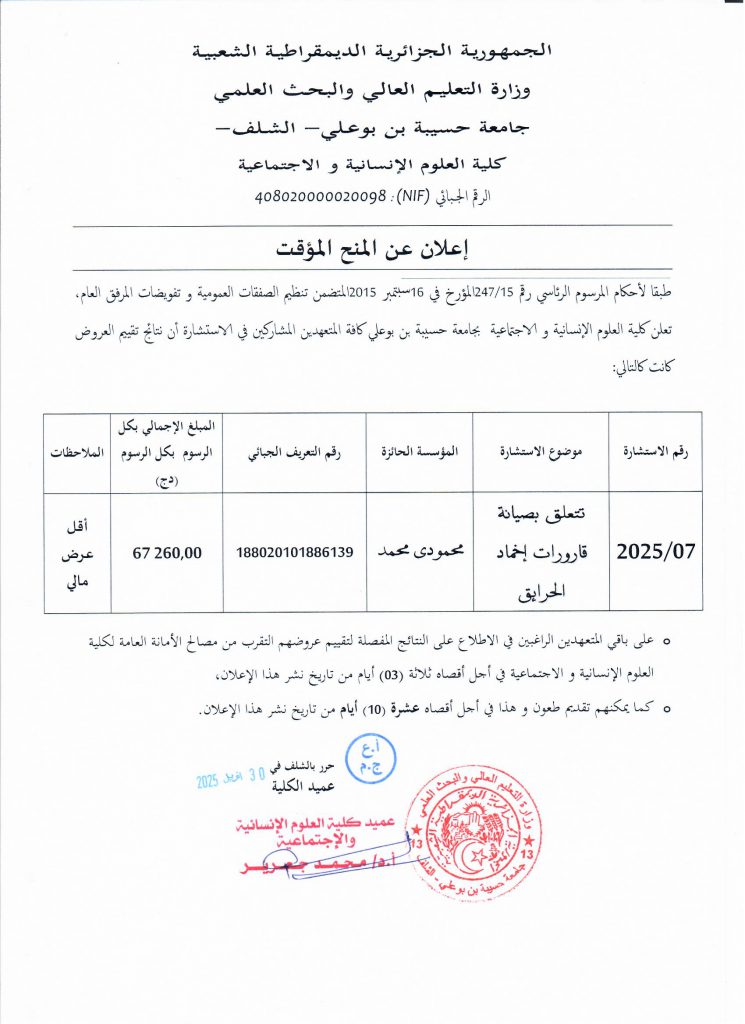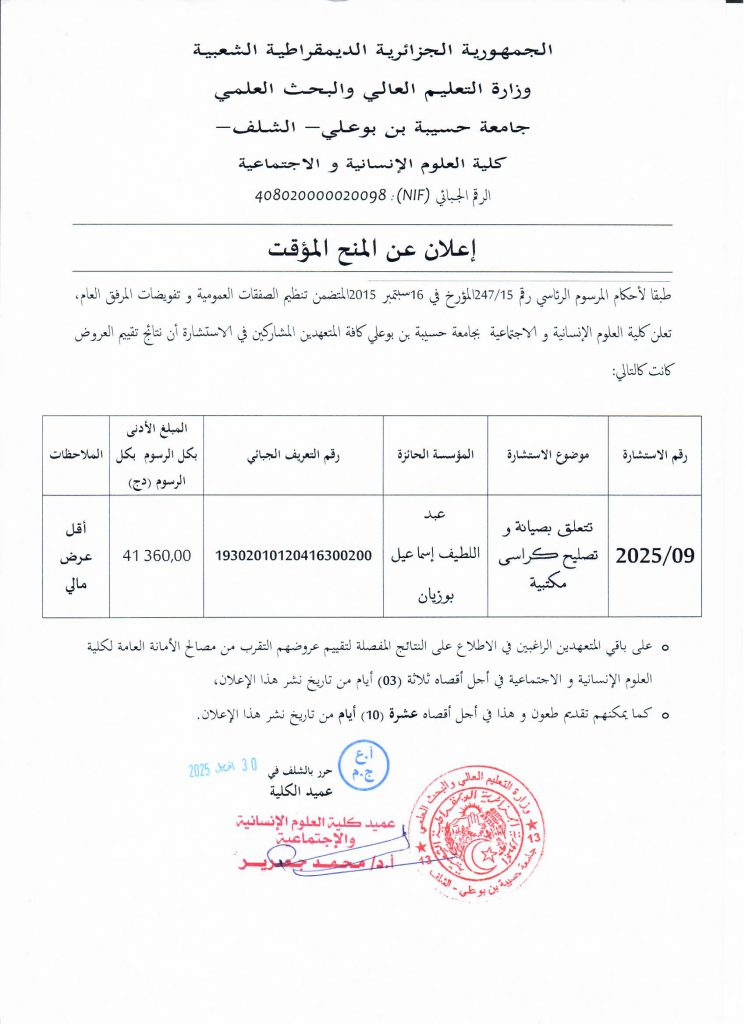 منح مؤقت للإستشارات رقم 11/10/09/08/07/ 2025 لكلية العلوم الإنسانية والإجتماعيةبواسطة zouatenia mhamed / 5 مايو، 2025