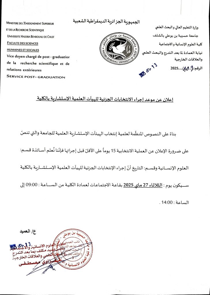 إعلان عن موعد إجراء الإنتخابات الجزئية للهيآت العلمية الإستشارية بالكليةبواسطة zouatenia mhamed / 15 مايو، 2025