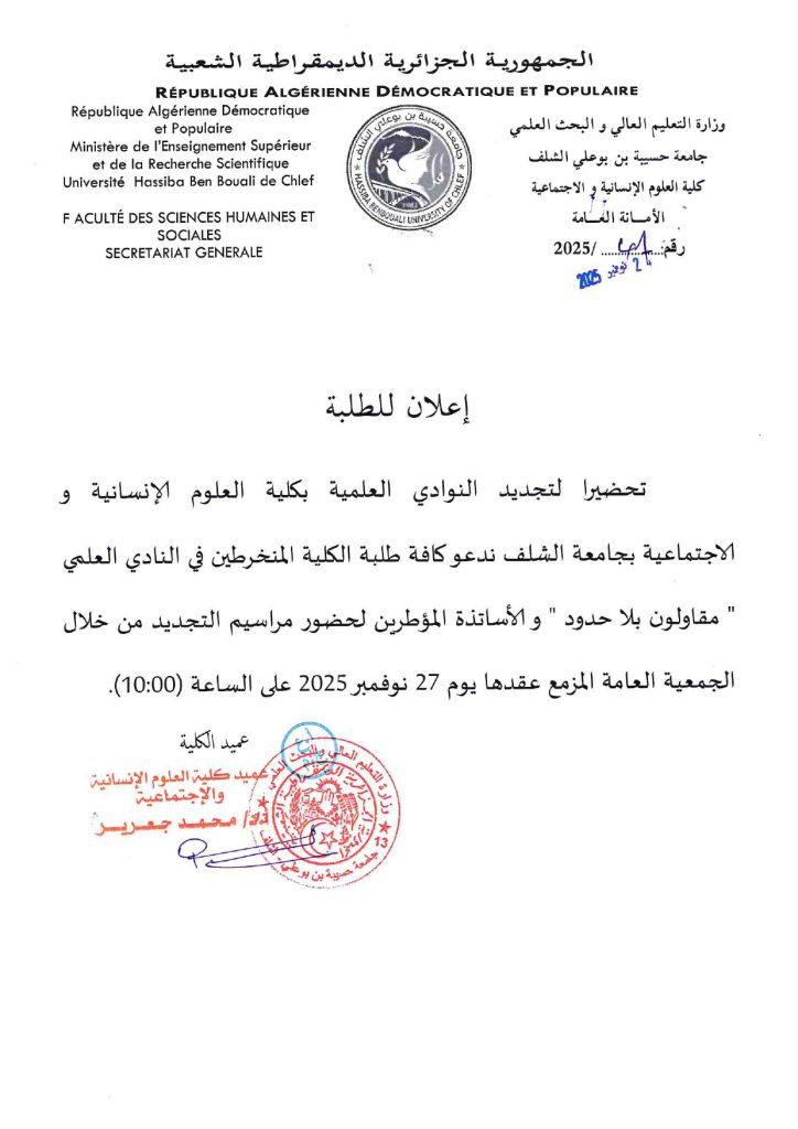 فتح الترشح لتجديد عضوية لجنة الخدمات الإجتماعية لجامعة الشلف