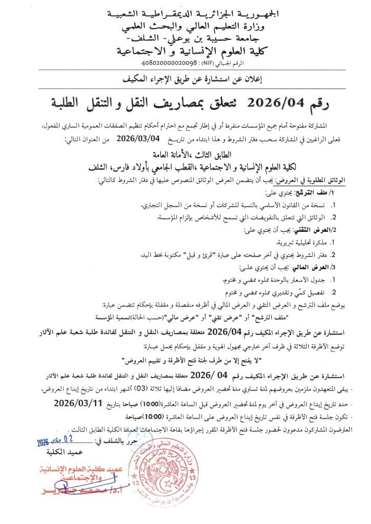 إعلان عن إستشارة رقم 03-2026 تتعلق بخدمات الإيواء والإطعام