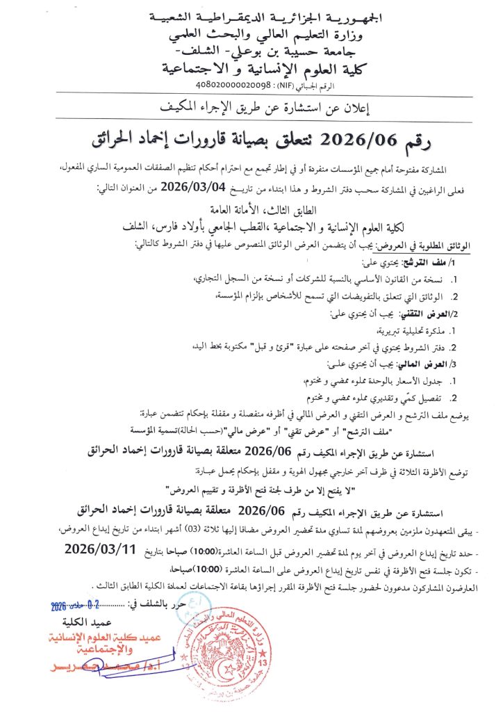 إعلان عن المنح المؤقت للإستشارة رقم 02-2026 تتعلق بخدمات الإطعام و الإستشارة رقم 03-2026 تتعلق بخدمات الإيواء و الإطعام